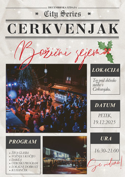 19dec.BOŽIČNI SEJEMCerkvenjak 25, CerkvenjakBOŽIČKOVANJE IN BOŽIČNI SEJEM V CERKVENJAKU Tradicionalni Božični sejem na trgu v Občini Cerkvenjak se vrača tudi letos! Dogodek, ki že vrsto let povezuje lokalno skupnost, bo znova napolnil trg z zimskimi vonjavami, otroškim nasmehom in prazničnim razpoloženjem. Na sejmu se bodo prepletali vonji dišečega čaja, domačega kuhanega vina in slastnih palačink. Obiskovalce bodo razveseljevali ustvarjalni kotički za najmlajše, praznične melodije ter bogata ponudba lokalnih in drugih razstavljavcev, ki bodo s svojimi izdelki poskrbeli, da boste praznična darila našli kar na enem mestu. Poseben čar dogodku bo ponovno dodal veličastni prihod Božička na kočiji, s katero se bodo lahko zapeljali tudi obiskovalci. Kdo ve – morda nas letos preseneti celo sneg. Petek, 19. december 2025, ob 16.30. Program se bo začel z ogledom odlične gledališke predstave ( -
